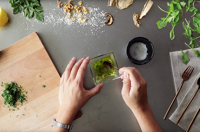 Mezcla el zumo de limón, aceite de oliva, perejil y una pizca de sal. Puedes hacerlo con un bote tapado y agitarlo enérgicamente durante medio minuto.