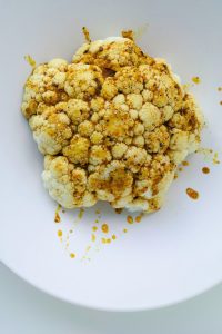 - Poner una sartén al fuego con la mantequilla, 2 cucharaditas de harina y 2 de cúrcuma. Rehogar unos segundos e ir añadiendo poco a poco, 1 dl de caldo de verduras y 1 dl de leche hasta obtener una salsa espesa. Salpimentar y retirar del fuego. Servir la coliflor con la salsa por encima y las pipas de girasol garrapiñadas.