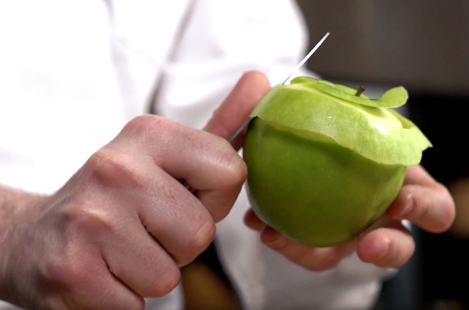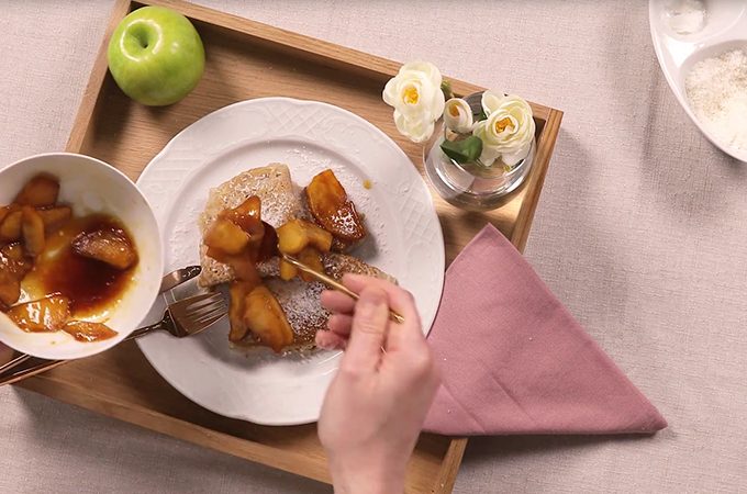 1. Corta las manzanas en láminas finas y caramelízalas en una sartén con un poco de aceite de coco y sirope de arce. Hazlo de 2 a 3 minutos como mucho.